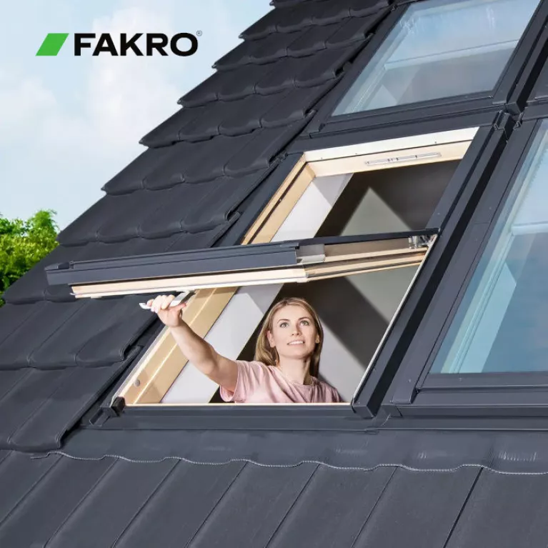 FAKRO oferuje również okna z podwyższoną osią obrotu, które zapewniają jeszcze większy komfort użytkowania oraz lepszy widok na zewnątrz. Tego typu konstrukcja umożliwia swobodne podejście do otwartego okna i zwiększa ilość światła wpadającego do pomieszczenia.